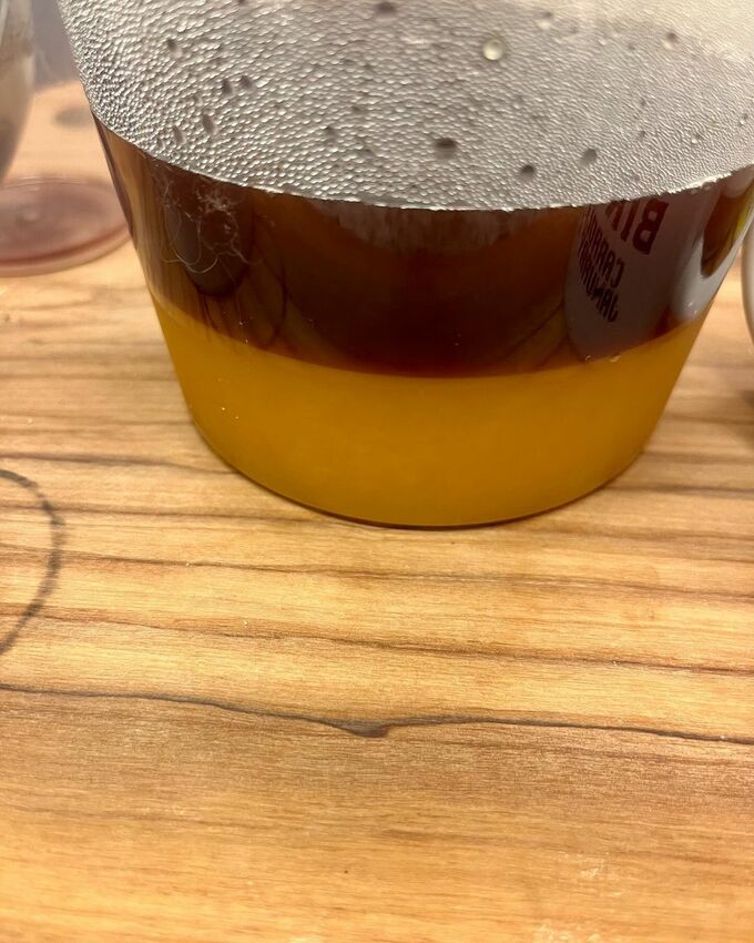 続けて「2500mlから300mlのジュースにゼライス2袋 オリゴ糖適量。」「ジュースの半分の量をマグカップにゼライス2袋とオリゴ糖を入れて混ぜ混ぜ、吹きこぼさないように40秒くらいチン。」「そして、残りのジュースを加え、粗熱を取ってから容器に! そして一層目を冷蔵庫!熱いまま入れるのは避けてください」「この作業を3回でも4回でも繰り返します。」と、記しました。