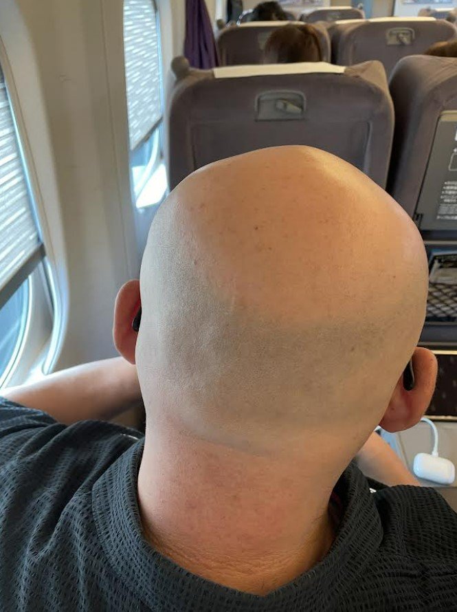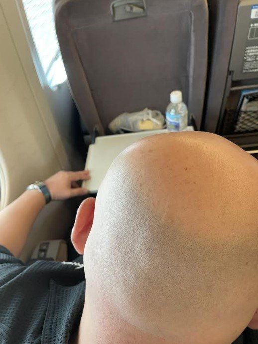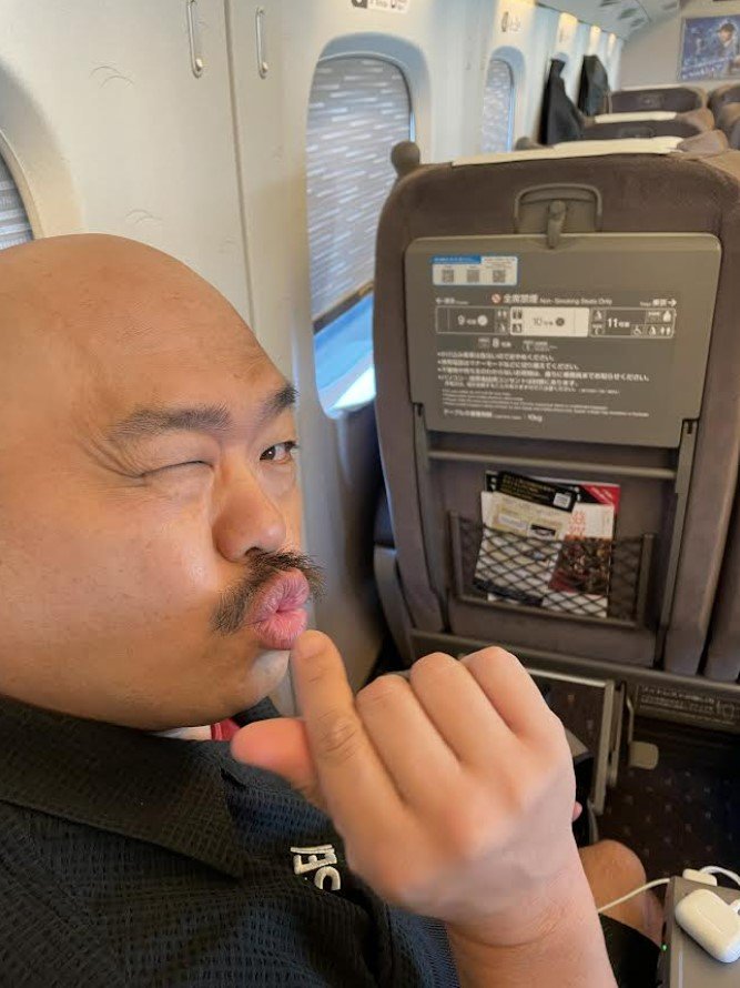 伊達みきおさんは「新幹線にて。。」と題したブログで「僕の前に座った、スキンヘッドの少し怖い雰囲気の人。。こっそり写真を。」と後ろ姿の写真をアップ。