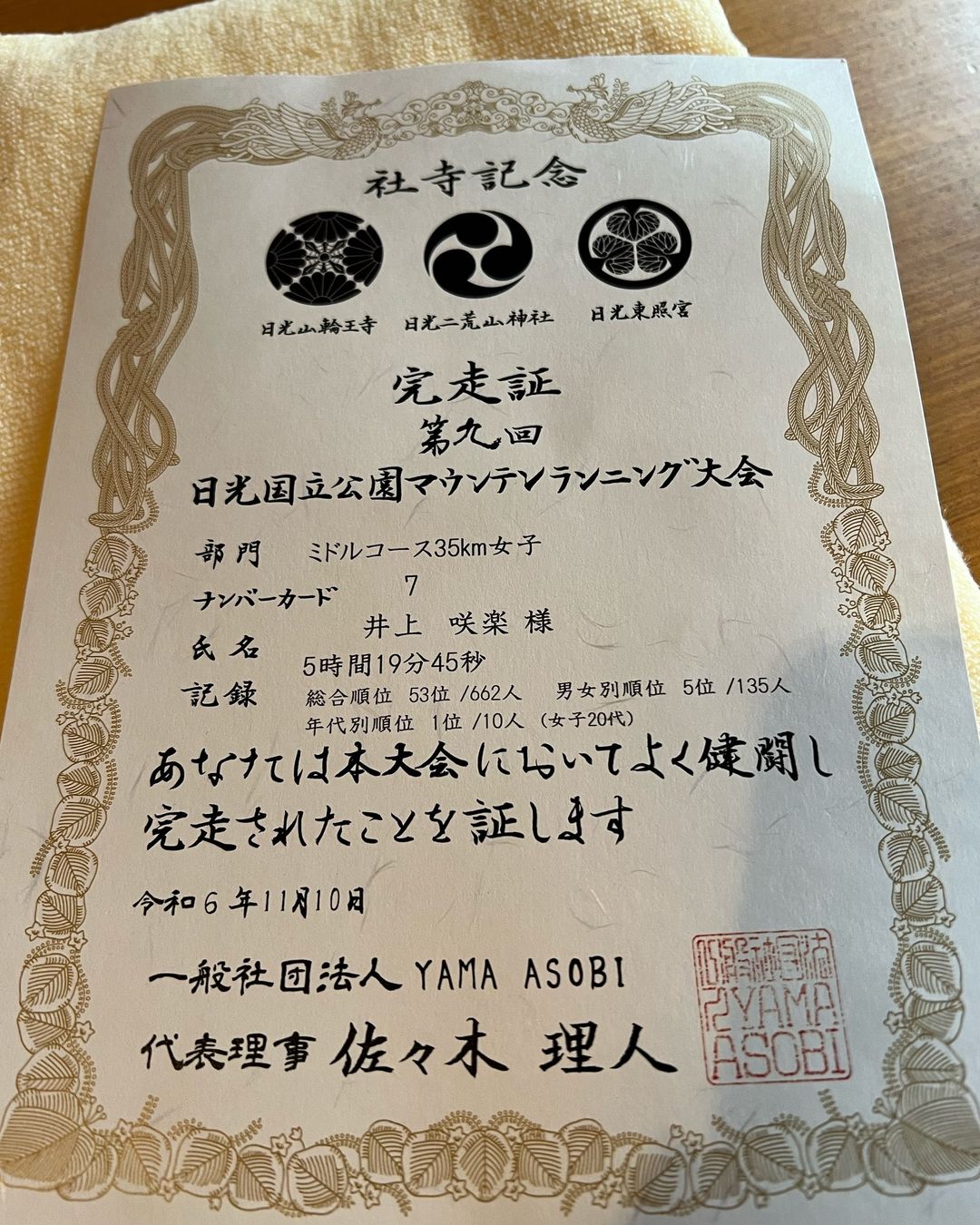 10日、タレントの井上咲楽さんが自身のインスタグラムを更新。『日光国立公園マウンテンランニング大会』で完走したことを報告しました。