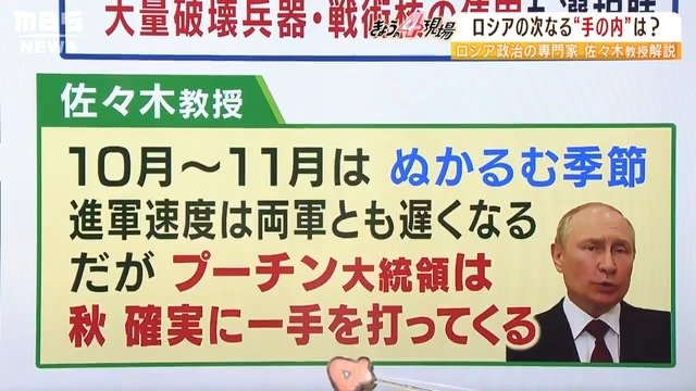 ―――今後のロシア、5つの可能性を先生に挙げていただきました。①国家総動員令②西側諸国のゼレンスキー疲れを誘う③友好国との協力を強化④ザポリージャ原発を「人質」⑤大量破壊兵器・戦術核の使用の選択肢。10月から11月はぬかるむ季節で、進軍速度は両軍ともに遅くなる、だが「プーチン大統領は秋、確実に一手を打ってくる」ということですが?