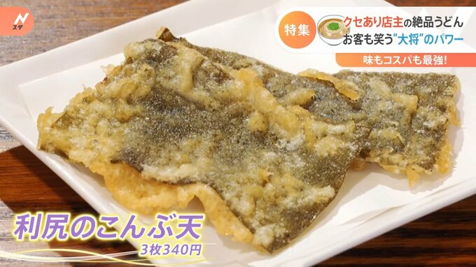 うどんの出汁をとった昆布をしょうゆ風味に煮込んで天ぷらにした人気の「利尻のこんぶ天」(3枚340円)。