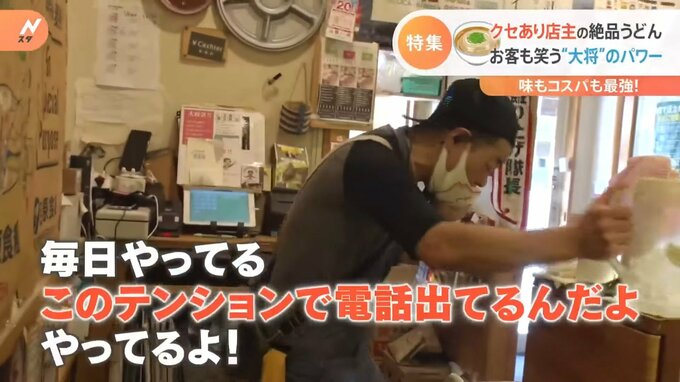 「はい!お電話ありがとうございます。うどん大地の大将です。大地は毎日やってますよ。年中無休だ。わかんない?毎日やってる。このテンションで電話出てるんだよ、やってるよ。これで休みですって言ったら変態だよね、マジで」