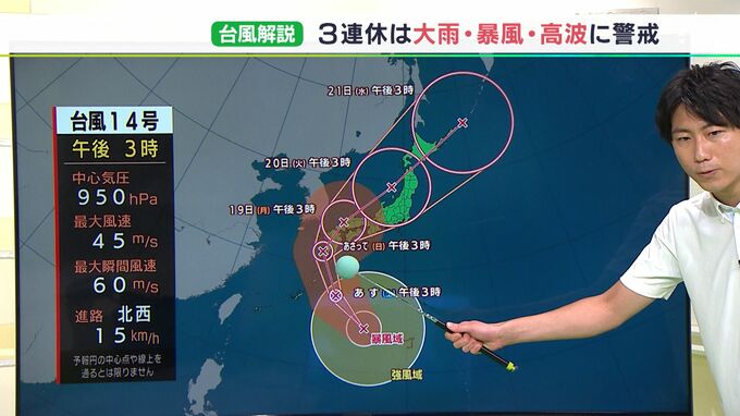 <田中健太郎気象予報士>大型で非常に勢力の強い台風14号は、日本の南を北上しています。今後、ほとんど勢力を落とさないまま、日曜日に九州に接近、上陸する恐れがあります。その後は北東方向に進路を変えて、月…