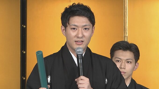 続けて“今日、持ってきたものがありまして…“とブルーグリーンのバトンを取り出し、“勘九郎兄や七之助兄さんが出ていた世代から、松也兄さんたちの代にバトンが渡されて、今年の「新春浅草歌舞伎」の千秋楽に(中村)米吉のお兄さんから僕と莟玉くんに託されたバトンでございます“と紹介し、“このバトンに誓って、バトンをもっともっと大きく重いバトンにできるように僕たちの代も一生懸命に務めてまいりたいと思います“と気合を込めて話しました。