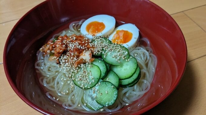 ゆで卵、キムチ、キュウリとゴマは自宅にあったものを追加しました。
