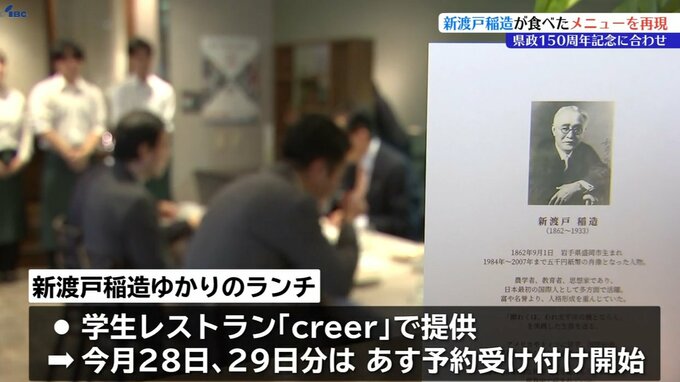 盛岡市の調理師専門学校の期間限定レストランで、岩手県政150周年に合わせ、郷土の偉人にちなんだランチが提供されます。