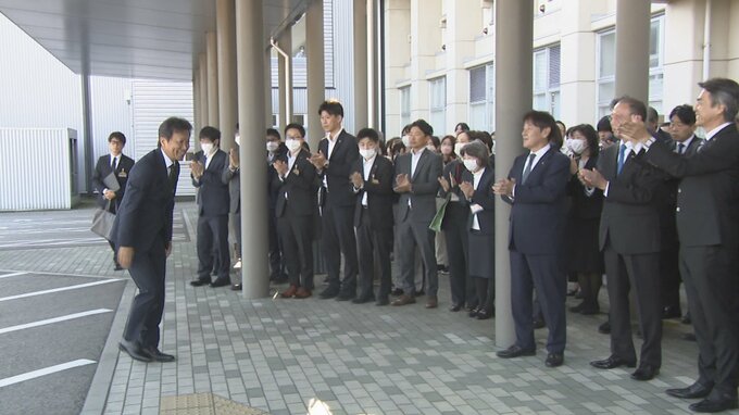 午前8時45分ごろ大勢の職員に出迎えられて市役所に初登庁しました。