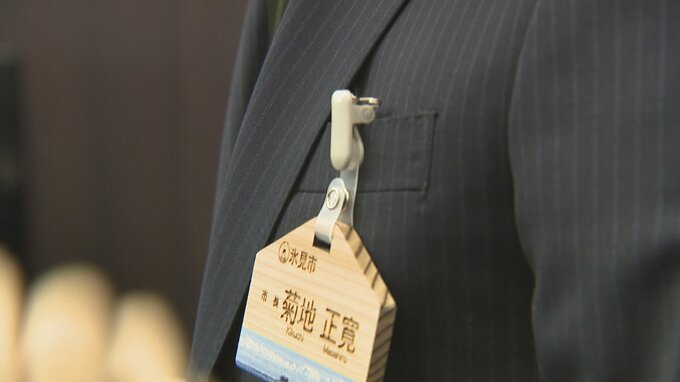 そのままさっそく市長室に入った菊地市長。市長職のバッジと名札をつけイスに座ると…