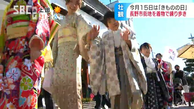 11日は3歳から83歳までのおよそ120人が、七五三や成人式、結婚式などで着る着物や普段着として楽しむ着物姿で、権堂のアーケードや善光寺に通じる中央通りなどを歩きました。