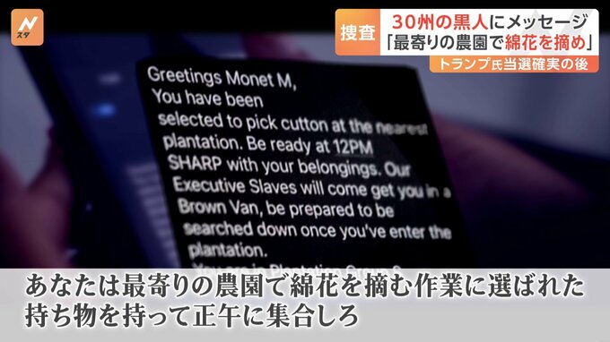 アメリカ大統領選でトランプ前大統領が当選確実となった後、全米の30州で黒人に人種差別的なメッセージが届くという被害が相次ぎ、当局が捜査に乗り出しています。トランプ前大統領がハリス氏を破って勝利したアメ…