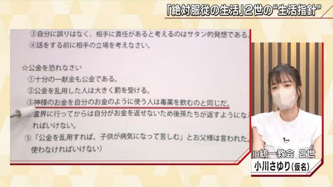 子どもの頃の辛い記憶を淡々と語る小川さんに、番組が入手した旧統一教会の内部文書を見てもらった。表題は『二世の生活指針』。日常生活から人生にかかわることまで多岐にわたり何項目もの指導が羅列されている。