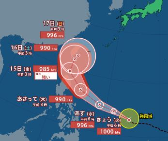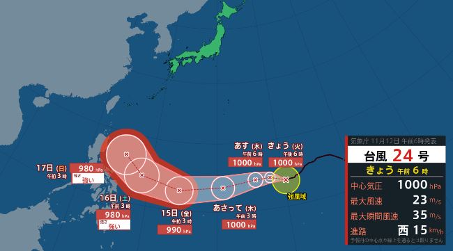気象庁によりますと、12日午前9時には、1時間におよそ30キロの速さで西北西に進んでいて、中心気圧は996ヘクトパスカル、中心付近の最大風速は23メートル、最大瞬間風速は35メートルです。