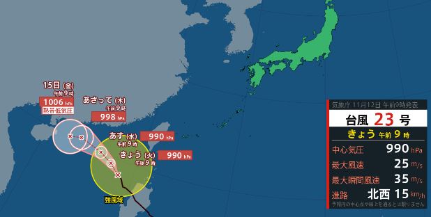 台風23号は12日午前9時現在、南シナ海を時速15キロの速さで北西に進んでいます。