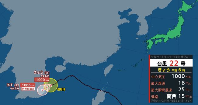台風22号は南シナ海を時速15キロの速さで南西に進んでいます。