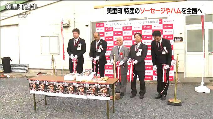 宮城県美里町で特産のソーセージやハムなどの加工食品を全国に届けるゆうパックの出発式が行われました。