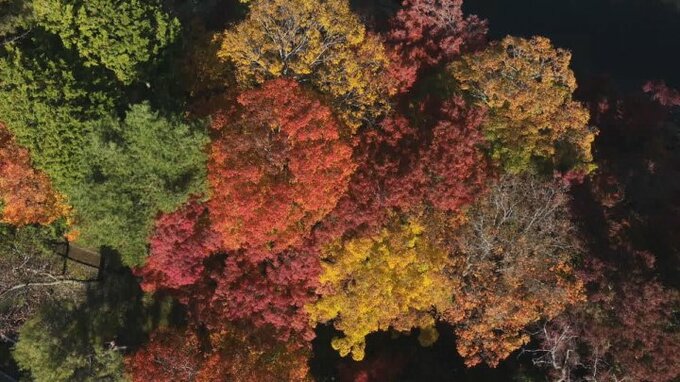 赤や黄色に色づいた湖畔で紅葉が見ごろを迎えています。