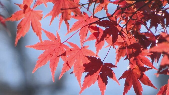 澄み渡る青空のもと、美しい「照り紅葉」