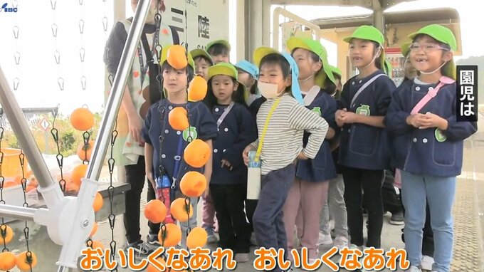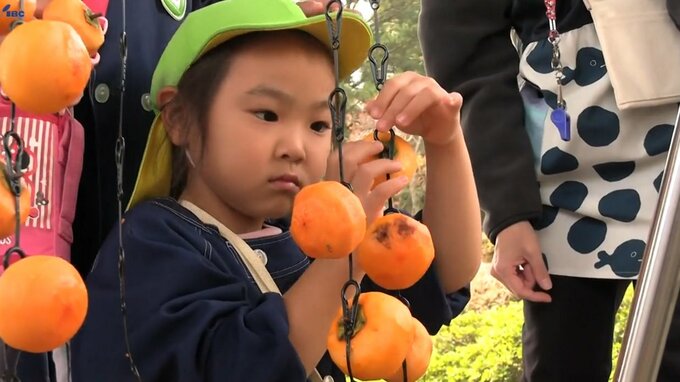 皮をむいたカキはさっそく駅のホームに運ばれ、散歩の途中だった地域のこども園の園児も手伝って、ひとつひとつ丁寧につるされていきました。