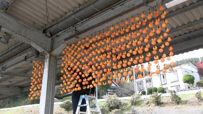 駅のホームにつるされたおよそ1000個のカキの「のれん」は、1か月ほど駅の利用者の目を楽しませながら、潮風を受けて「干し柿」となります。