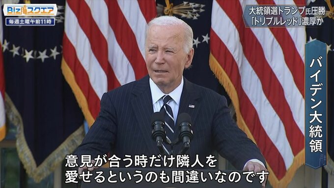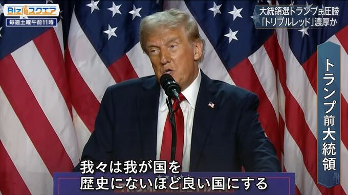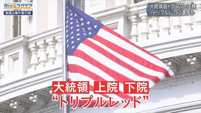 大統領選と同時に行われた議会選挙でも、共和党は上院多数派を4年ぶりに奪還。開票作業が続く会員でも共和党が大きくリードしており、「大統領」だけでなく、「上院」と「下院」でも主導権を握る共和党の「トリプルレッド」が間近に迫っている。トランプ氏は「我々は再び米国第一を推進する。米国を第一にせねばならない。立て直さねばならない」と発言した。