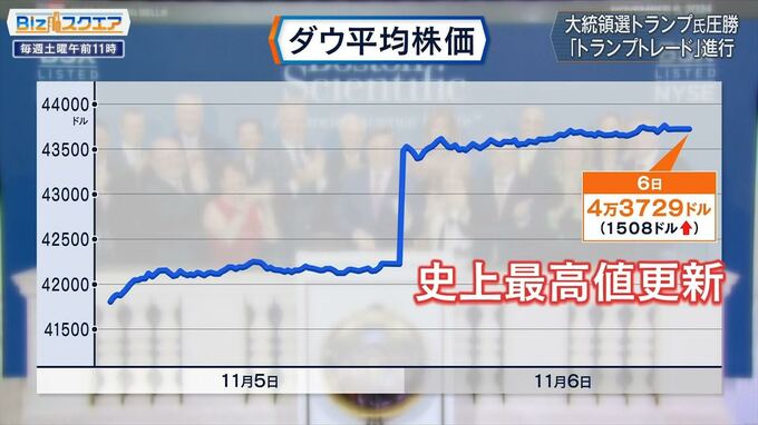 また、ニューヨーク株式市場のダウ平均株価は前日と比べて1508ドル高い4万3729ドルで取引を終え、史上最高値を更新した。トランプ氏は「我々には新しいスターがいる。スターが誕生した。イーロンだ」と発言。行政改革の要職にテスラCEOのイーロン・マスク氏を起用することを示唆。テスラの株価も、前日より15%近く上昇した。