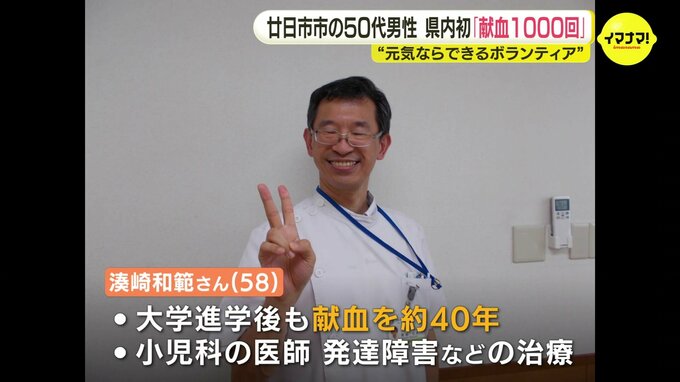 廿日市市に住む 湊崎和範 さん(58)です。献血の1000回目を記念して、広島県赤十字血液センターから感謝状が贈られました。兵庫県出身の湊崎さんが献血を始めたのは、高校生の時でした。