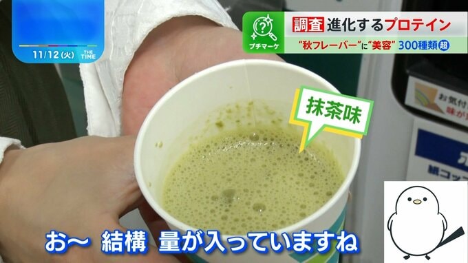 プロテイン売り場の一角にあり、1杯100円。ココア味・抹茶味のプロテインと、グレープ味のEAA(必須アミノ酸)の3種類を試飲できるので、苦手な味を買ってしまう心配もありません。