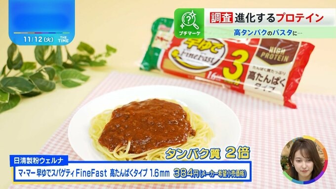 「マ・マー早ゆでスパゲティFineFast 高たんぱくタイプ 1.6mm」(日清製粉ウェルナ・メーカー希望小売価格384円/300g)は、通常よりもタンパク質が2倍のパスタ。