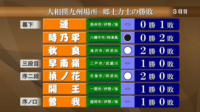 大相撲九州場所3日目郷土力士の取り組み結果です。