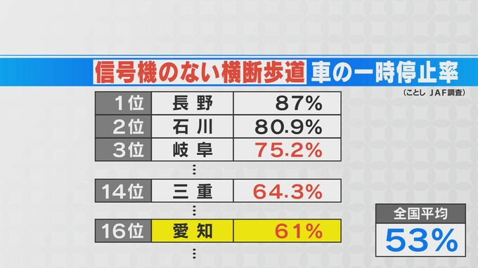 JAFが毎年調査している一時停止率。ことしの全国ランキングは、1位が長野で停止率87%、2位が石川で80.9%、3位が岐阜で75.2%。