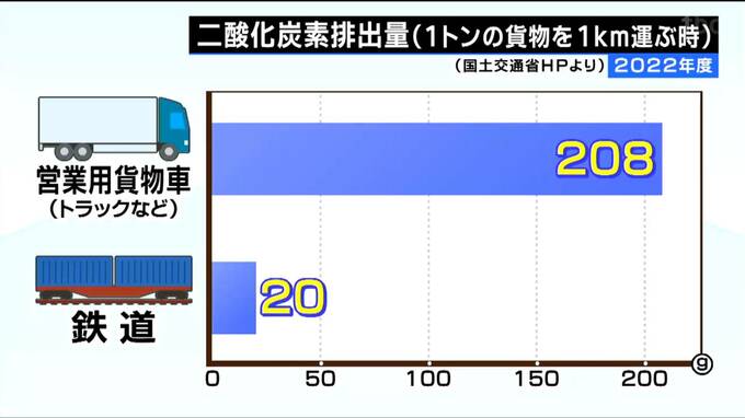 1トンの貨物を1km運ぶ時に排出される二酸化炭素の量の比較です。トラック=営業用貨物車が208㌘なのに対し、鉄道は20グラム。鉄道輸送への転換により90%以上の二酸化炭素排出量の削減が可能になります。