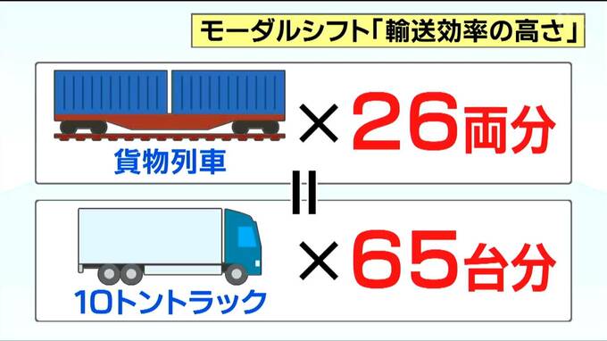 貨物列車1編成(最大26両)で一度に10トントラック65台分を輸送することができ、ドライバー不足の解消にも繋がります。