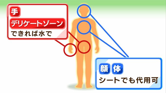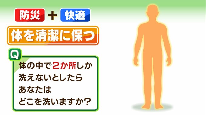 「まだ間に合う防災の準備」被災時に備える物は?100均の商品で作れる『災害用トイレ』国際災害レスキューナースが解説 毎日放送 2022年9月17日(土) 18:18 国内 体を清潔に保つには?トイレは汲んだ水で流してはダメ!? ――次のテーマは『衛生』についてです。災害時に体を清潔に保つという上で、大事なポイントは『手とデリケートゾーンはできれば水』で、そして『顔や体はシートでも代用可』ということなんですね? 「例えば体をふくときは、赤ちゃんのおしりふきを使っていただくと全身ふけます。デリケートゾーンもこれで大丈夫です。しかし、水で洗った方がたぶんさっぱりすると思います。今はコロナ禍ですので、やはり手は水で洗いたいという欲求が高いので、ぜひ使っていただきたいです。ただお水は限られていますから、ペットボトルからざっと出さずに、ペットボトルのキャップに穴を開けてシャワーにして使っていただくといいと思います」