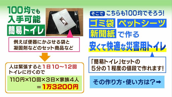 ――ではどうすればいいのでしょうか。例えば100円ショップなどでも入手可能な『簡易トイレ』(便器にかぶせる袋と凝固剤がセットになったもの)はもちろん使えますが、人は緊張すると1日に10~12回もトイレに行くということです。災害時は精神が不安定になり、トイレに行く回数も増える可能性があるので、意外とお金がかかります。そこで辻さんが教えてくださるのが『災害用トイレ』です。こちらも100円ショップで揃うゴミ袋・ペットシーツや新聞紙を使い、安くて快適な災害用トイレができるということです。簡易トイレセットの5分の1程度の値段で作れるということです。どのように作るのでしょうか?