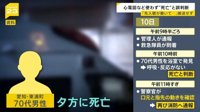 そのうち2人の救急救命士が、浴室に意識不明の状態で倒れていた70代の男性を、呼吸や反応がないなどの理由で“死亡”と判断、病院に搬送しませんでした。しかし午前11時すぎ、引き継いだ警察官が男性の口元と指先がわずかに動いたのを確認し、再び消防へ通報。