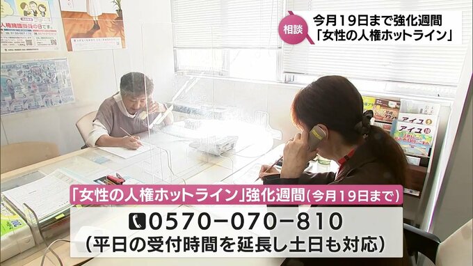 配偶者からの暴力や職場でのハラスメントなどさまざまな相談を受け付ける「女性の人権ホットライン」の強化週間が13日から始まりました。「女性の人権ホットライン」は、配偶者やパートナーからの暴力、職場のハラ…