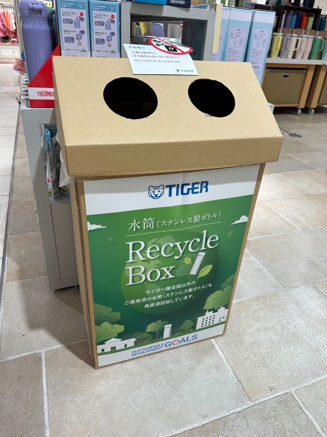 滝沢さんは、使い古しの水筒=マイボトルについて「家庭から出すと資源にならずにごみになります」と知らせつつ「タイガーさんが回収しているので、持っていくと資源として活用されますよ!」と案内しています。