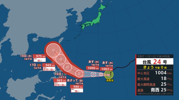 【台風情報】台風25号(ウサギ)フィリピンの上をカーブして進み「沖縄の南」へ… その後“ノロノロ”と“ウロウロ”迷走か 日本の南側で蠢く台風【13日午後2時20分・最新進路更新】 青森テレビ 2024年11月13日(水) 14:20 国内 3つの台風の「最新進路予想」