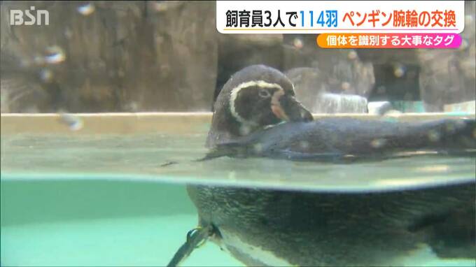 新潟市水族館・マリンピア日本海で13日、毎年の“恒例行事”となっている『ペンギンの腕輪交換』が行われました。この腕輪は、日光による変色などで劣化してしまうため1年に1度交換しています。まずは、飼育員らが…