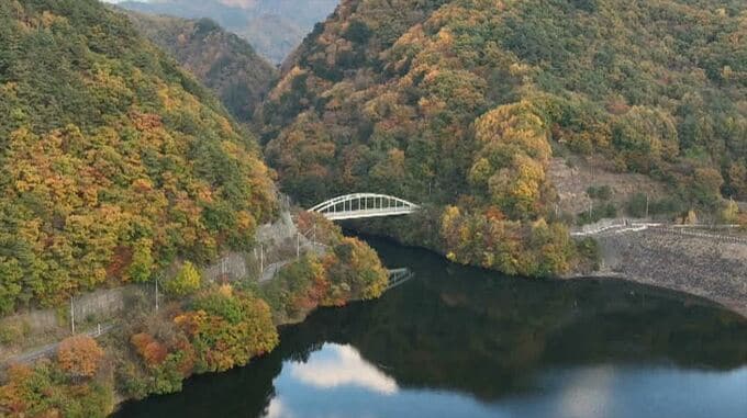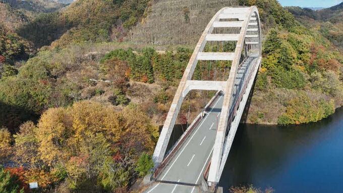 1998年にできた人工の湖で、湖にかかる白いアーチ型の「鹿鳴峡大橋」がチャームポイントです。