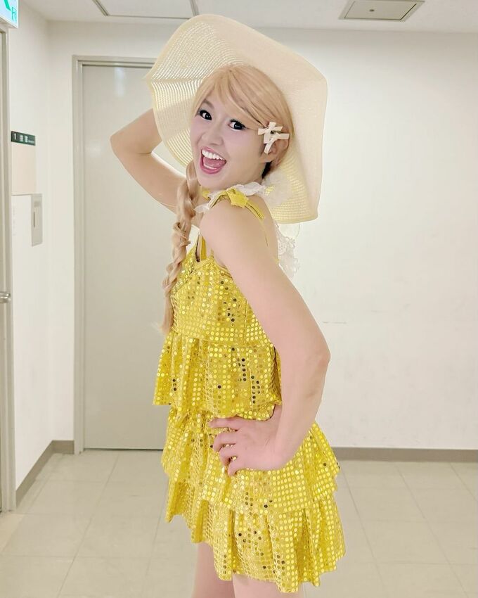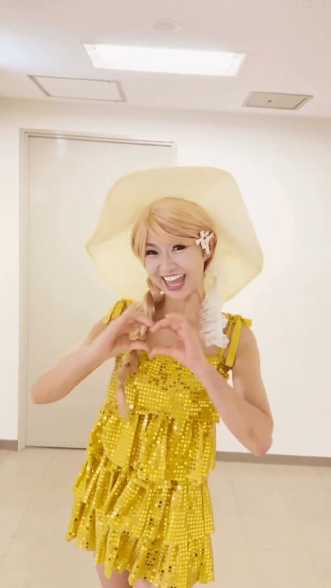 さゆりさんは「こないだMISAMOちゃんの『ニュールック』踊ってみた動画で❤ 最後❤変身した時のお写真です〜」と、黄色い衣装の写真をアップ。