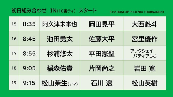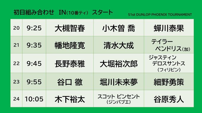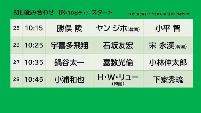 また、県関係では、日章学園高校出身の香妻陣一朗選手が午前9時50分にアウトスタート、宮崎市田野町出身の小浦和也選手が、午前10時45分にインスタートです。