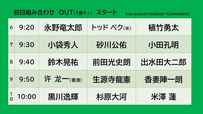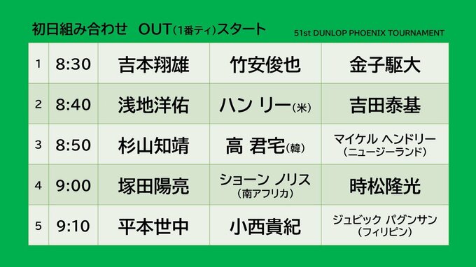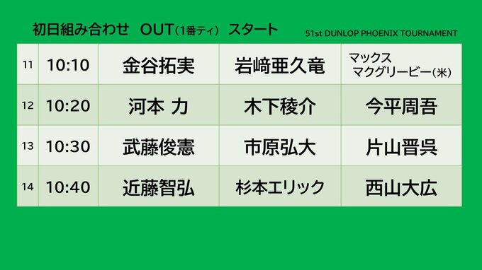 14日に宮崎市のフェニックスカントリークラブで開幕する「ダンロップフェニックストーナメント」、初日の主なペアリングとスタート時間です。