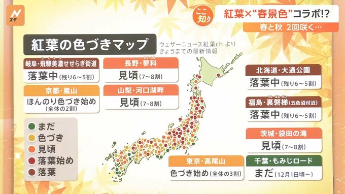 もう既に北海道・福島では落葉中ということですが、今見頃を迎えているのは、茨城でしたり長野、山梨の辺りです。