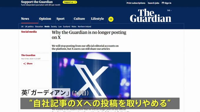 イギリスの有力紙「ガーディアン」は、SNSの「X」への記事の投稿を取りやめると発表しました。「所有者のイーロン・マスク氏が政治的な言説を形作るのに利用している」などと指摘しています。イギリスの「ガーディ…