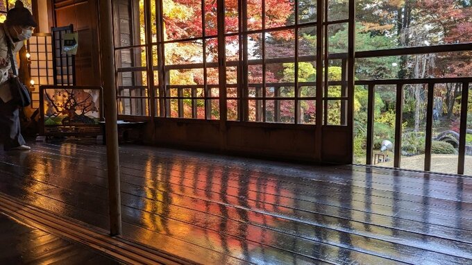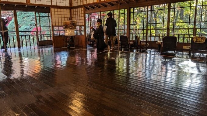 特に人気なのは、約30畳の板の間の床に映る紅葉の景色です。
