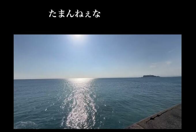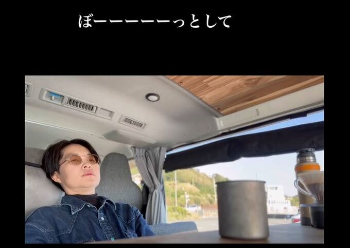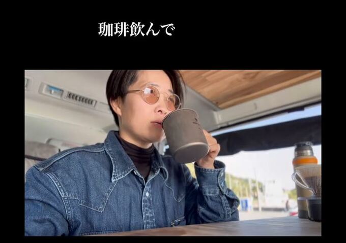 さらに、大好きなコーヒーを淹れる模様につなぎ、コーヒーを飲む自撮りへ。「珈琲飲んで」「江ノ電見て」「ぼーーーーーっとして」と、車内と車窓の光景を並べ、また海の景色にもどって「たまんねぇな」と、心の底からの声を乗せています。