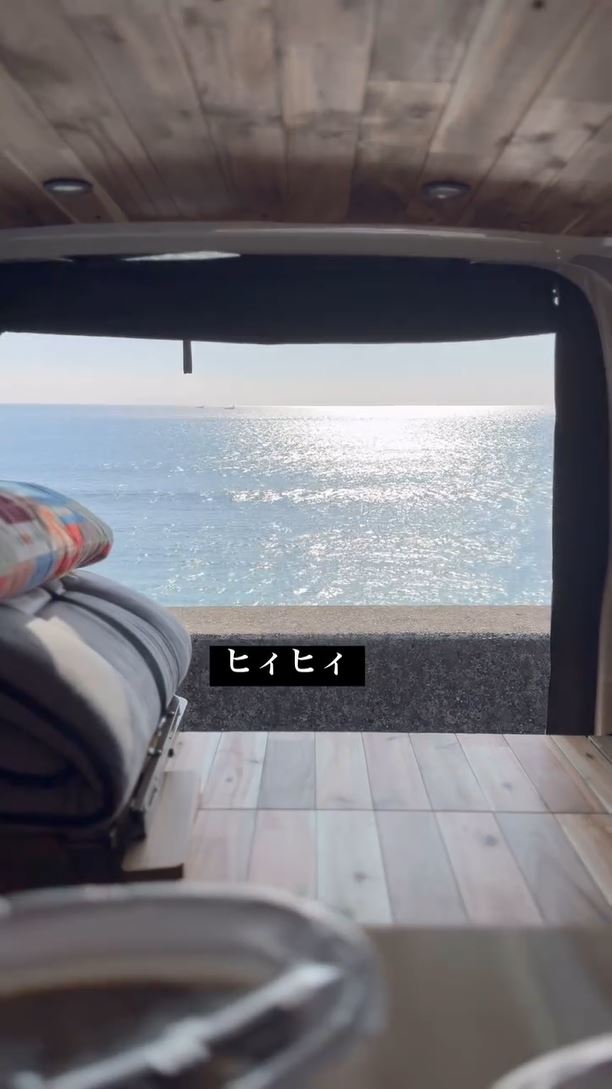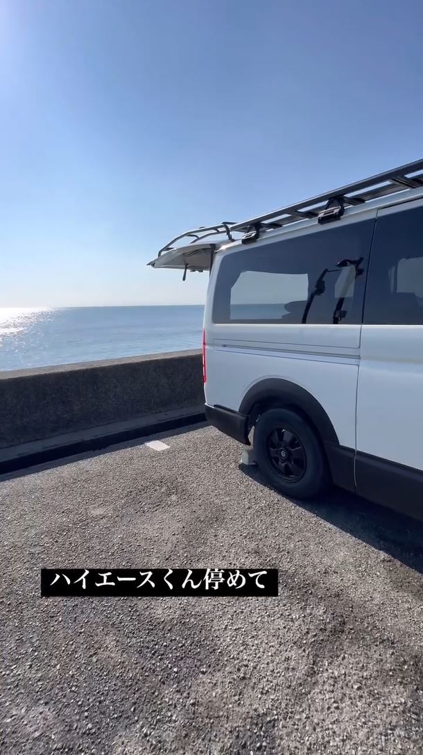 そんなイモトさんは、海辺でのドライブの休憩中の動画を投稿。「ハイエースくん停めて」とテロップを入れた先には、太陽を浴びて輝く海が。