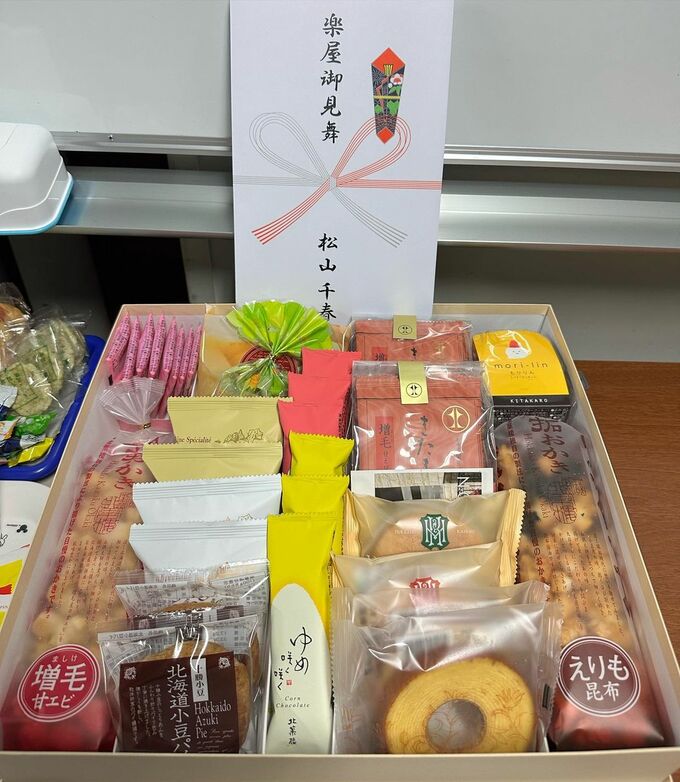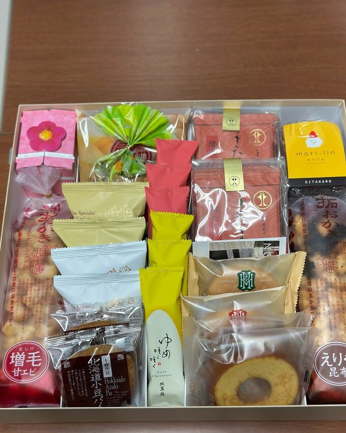 投稿された写真では、バウムクーヘンや、おかき、小豆パイなど、美味しそうなお菓子の数々が見て取れます。
