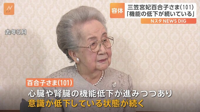 容体が悪化している三笠宮妃百合子さまについて、宮内庁の西村長官は心臓や腎臓の機能の低下が続いていると明らかにしました。西村宮内庁長官はきょう午後の定例会見で、今月7日の検査で全身の機能の低下が明らか…